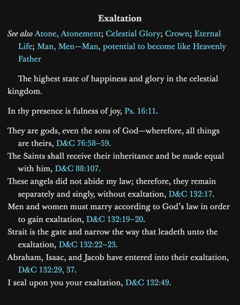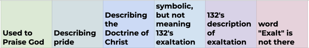 And then there are some passages referenced where the word Exalt or Exaltation is not there (pink) but they are suggesting 132's exaltation is implied in these passages. (I've selected what I believe the passage is saying, and some most definitely are only speaking of Eternal Life, but you're welcome to disagree and choose for yourself.)